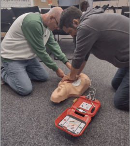 Weiterhin haben wir Reanimationspuppen bekommen, mit denen Die Herzdruckmassage und der Einsatz des Defibrillators geübt werden können. Freitag besuchte uns eine Mitarbeiterin der Björn-Steiger-Stiftung und unterwies die Lehrerinnen und Lehrer der Oberstufe in den Umgang hiermit. Zukünftig üben die Schülerinnen und Schüler der Oberstufe regelmäßig die Wiederbelebung um in Notfällen Menschenleben retten zu können.